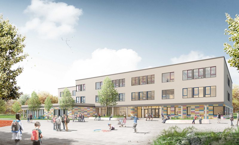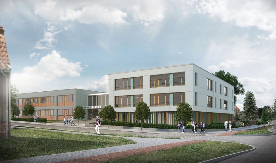 Die Grundschule „Am Wasserturm“ in 14624 Dallgow-Döberitz ist eine verlässliche Halbtagesgrundschule für die Klassenstufen 1-6, die auf zwei Standorte verteilt ist. Durch den Neubau wird eine barrierefreie Erschließung des bestehenden Schulgebäudes und des Erweiterungsneubaus ermöglicht und ein zentraler Haupteingang für Hort und Schule geschaffen. Außerdem wird das Raumkonzept so ausformuliert, dass neben den traditionellen Klassenräumen großzügige Gruppen-/ Mehrzweckräume und Lernlandschaften entstehen, die individuelle Fördermöglichkeiten und Rückzugsbereiche anbieten. Die Fertigstellung ist für 2020 geplant.