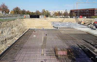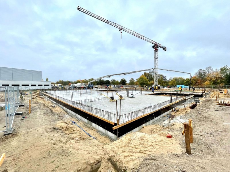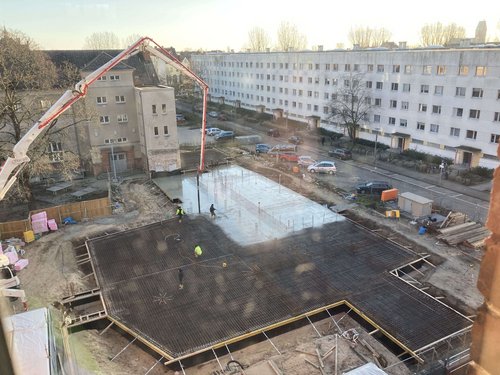 Mit der Herstellung der Bodenplatte wird der Baustart für die Einrichtung einer neuen Kita, geplant von GALANDI SCHIRMER | ARCHITEKTEN + INGENIEURE GMBH, in der Gartenstadt Nord im Bornstedter Feld, Potsdam, gegeben. Architektonisch zeichnet sich die neue Kita durch ihre Panoramafenster aus, mit der eine spielerische Verbindung zwischen dem Innen- und Außenraum geschaffen wird. Die bauliche Fertigstellung der Kita wird vorrausichtlich Mitte 2022 erfolgen. (Fotograf: Benjamin Maltry)