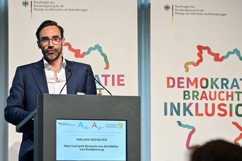 Christoph Schirmer von GALANDI SCHIRMER | ARCHITEKTEN + INGENIEURE GMBH hält bei der Regionalkonferenz der Architektenkammern Berlin und Brandenburg in Kooperation mit der Bundesarchitektenkammer und dem Beauftragten der Bundesregierung für die Belange von Menschen mit Behinderungen einen Vortrag über ein Best-Practise zum Thema "Inklusiv gestalten – Ideen und gute Beispiele aus Architektur und Stadtplanung" am 12.09.2022 im Futurium in Berlin. Anhand des Neubaus Rote Kaserne West (WA 7) im Quartier „Rote Kaserne West“ des Bornstedter Feldes in Potsdam stellt Herr Schirmer die Besonderheiten des inklusiven Bauens vor und berichtet aus der Praxis. (Foto: Boris Trenkel)