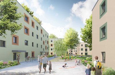 GALANDI SCHIRMER | ARCHITEKTEN + INGENIEURE GMBH übergibt die Neubauten der Wohnanlage Rote Kaserne (WA 7) mit 157 Wohungen und 4 Wohngemeinschaften fristgerecht im Frühjahr 2022 an den Auftraggeber. Von 2018 bis 2022 hat GSAI die Leistungsphasen 1 - 9 erfolgreich begleitet. Dabei wurde der Auftrag des inklusiven Bauens ab Leistungsphase 1 konsequent über die nachfolgenden Phasen weitergetragen und umgesetzt, um die Einheiten je nach Bedarf der Mieterschaft barrierefrei anbieten zu können. Die vielfältigen Wohnungstypen sind für viele Zielgruppen attraktiv und ermöglicht einen Querschnitt aller Altergruppen.