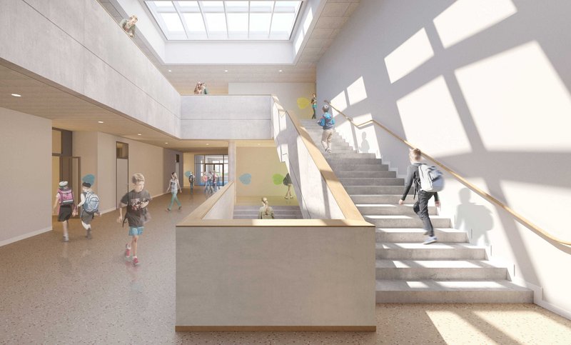 GSAI übernimmt die Generalplanung (LPH 1 - 9) für den Neubau einer vierzügigen Grundschule in der Gemeinde Stahnsdorf. Die kompakte Bauform mit drei Vollgeschossen sowie zwei Innenhöfen zur natürlichen Belichtung soll im Juni 2024 fertiggestellt werden. Für Schul- und Sonderveranstaltungen ist eine Aula für max. 400 Personen sowie eine Mensa mit Ausgabeküche für max. 250 Personen je Durchgang geplant. Das Raumkonzept, welches vier pädagogische Cluster mit Raumverbünden und Differenzierungsflächen beinhaltet, bieten die Möglichkeit unterschiedlicher pädagogischer Bespielung. Zusätzlich wird ein Farbkonzept mit Farbwelten als Leitsystem entwickelt. Technisch wird eine Soleleitung aus Abwasserwärmenutzung, Sole-/ Wärmepumpen mit zwei Pufferspeichern und maschinelle Lüftungsanlagen verbaut.
