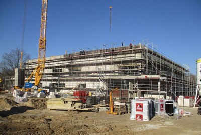 Bei der Erweiterung und Umbau des Fontane-Gymnasiums in Rangsdorf gehen die Arbeiten zügig voran. Nach Abschluss der Rohbauarbeiten beginnen die Fenstermontage sowie die Fassadenarbeiten.