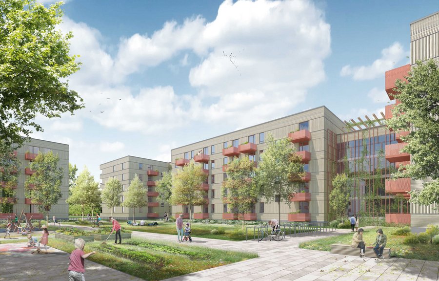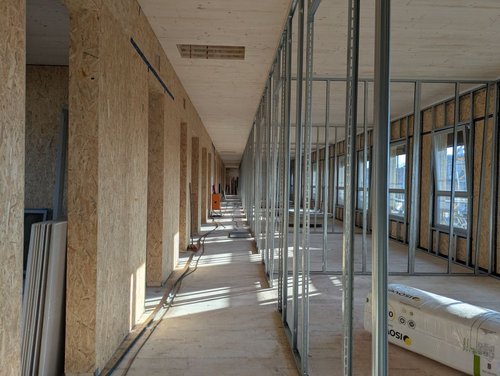 Einen Neubau in Holzbauweise zu bauen, ist nachhaltig und wirtschaftlich. Der nachwachsende Baustoff Holz ist hochökologisch, da er große Mengen CO2 bindet und am Ende des Lebenszyklus vollständig recycelbar ist. Er schafft ein gesundes Raumklima, fördert das Wohlbefinden und ermöglicht eine schnelle und emissionsarme Bauweise. Die Wirtschaftlichkeit eines Neubaues kommt erheblich durch die freie Technologie- und Materialwahl in der Ausführung zum Tragen. Zusätzlich spielt die Wahl der Bauweise, ob konventionell, modular oder seriell, eine entscheidene Rolle. Ein weiterer Vorteil liegt im hohen Vorfertigungsgrad bei der Erstellung der Bauteile in den Werken, die im Ganzen transportiert und auf der Baustelle binnen kürzester Zeit montiert werden. Davon profitieren auch die umliegenden Bewohner, denn ein hoher Personalaufwand und baubedingte Lärmimmissionen auf der Baustelle werden deutlich reduziert. Die Konstruktionsart verspricht in Zeiten von gestörten Lieferketten größtmögliche Kosten- und Terminsicherheit. Sich wiederholende und standardisierte Bauteile wie Balkone, Fenster, Treppen usw. tragen zusätzlich zur Wirtschaftlichkeit bei und schaffen die Voraussetzung, den engen Kostenrahmen für den öffentlich geförderten und preisgedämpften Wohnraum einzuhalten.