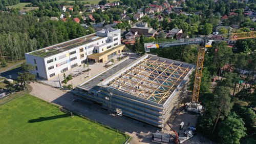 In den kommenden Jahren soll die Heinz Sielmann Oberschule in Wustermark zu einem Schulzentrum weiterentwickelt werden. Als erster Baustein des Campus wird die Dreifeldsporthalle mit einer Tribünenanlage für max. 199 Personen für den Schulsport- und Wettkampfsport auf dem Baugrundstück auf Grundlage der Generalplanung der GALANDI SCHIRMER | ARCHITEKTEN + INGENIEURE GmbH errichtet. Die Zimmererarbeiten der Dachkonstruktion sind nun abgeschlossen und der Rohbau steht.